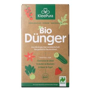 KleePura BioDünger aus 100 % Bio-Klee und Bio-Luzerne ist der erste durch einen Bio-Anbauverband zertifizierte BioDünger. Kleepura besteht aus 100 % ökologisch erzeugtem Klee und Luzerne und ist rein pflanzlich.KleePura enthält keine Reststoffe der Massentierhaltung oder der konventionellen Lebensmittelindustrie.KleePura ist ein veganer BioDünger für durch und durch ökologisches Gärtnern, für gesundes Obst und Gemüse, für bezaubernde Blüten und aromatische Kräuter. Klee und Luzerne haben die herausragende Eigenschaft in Gemeinschaft mit Bakterien an seinen Wurzeln Luftstickstoff zu binden. Der im Klee- und Luzerneaufwuchs eingelagerte Stickstoff bildet mit allen anderen Nährstoffen und Spurenelementen ein wunderbares vollökologisches Düngemittel für den Haus-, Klein- und Balkongarten.KleePura wurde im Rahmen eines Forschungsprojektes speziell für den ökologischen Erwerbsgartenbau entwickelt und erfolgreich getestet.Im Herbst 2017 wurde KleePura mit dem Umweltpreis des Sächsischen Staatsministerium für  Umwelt und Landwirtschaft in der Kategorie "Umweltfreundliches Produkt" ausgezeichnet.