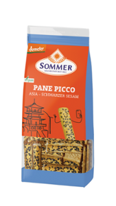 Man könnte es Fusion-Küche nennen: Eine aus dem fernen Osten inspirierte Gewürzkombination macht diese Pane Picco so unwiderstehlich lecker. Denn hier treffen schwarzer Sesam auf Curry und Tamari, eine natürlich fermentierte Sojasoße. Hinzu kommen Dinkel- und Vollkorn-Gerstenmehl, hochwertiges Olivenöl und ein Hauch Chili und fertig ist das kleine Brot, das wunderbar pur oder mit Dip schmeckt. Die Chips-Alternative ist vegan und in bester Bio-Qualität. Die Zutaten stammen aus der wohl nachhaltigsten Landwirtschaft, der Demeter-Landwirtschaft.