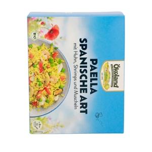 52% Reis* gegart (Wasser, Reis*, Speisesalz, Kurkuma*), Erbsen*, 7% Hühnerfleisch* gegart, Gemüsepaprika*, BUTTER*, 5% SHRIMPS** (SHRIMPS**,