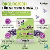 AlmaWin Vollwaschmittel zeichnet sich durch seine hervorragende Waschkraft bereits ab 30 °C aus. Ein Waschkraftverstärker aus aktivem Sauerstoff entfernt selbst schwierige Flecken und lässt weiße Wäsche nicht vergrauen. Es enthält gentechnikfreie Enzyme sowie Reisstärke und sorgt für gute Griffigkeit und einfaches Bügeln.Für alle weißen und farbechten Textilien geeignet, ausgenommen Wolle und Seide.Das AlmaWin Vollwaschmittel ist durch ECOCERT zertifiziert und dermatologisch erfolgreich getestet. Es enthält keine synthetischen Duft-, Farb- und Konservierungsstoffe und ist frei von Phosphat, Chlor und optischen Aufhellern. Das garantiert eine gute Hautverträglichkeit.
